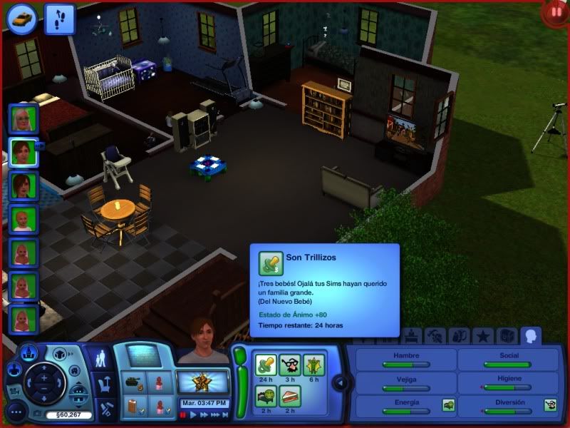 Tambien, puse el tratamiento para la fertilidad, tanto en el padre como en la madre, y los tuve como 7 horas en la habitacion probando para tener un bebe (no me salia la musiquita xD). Tambien la puse a ver la tele infantil, y el estereo con musica infantil, pero eso no influye seguro.